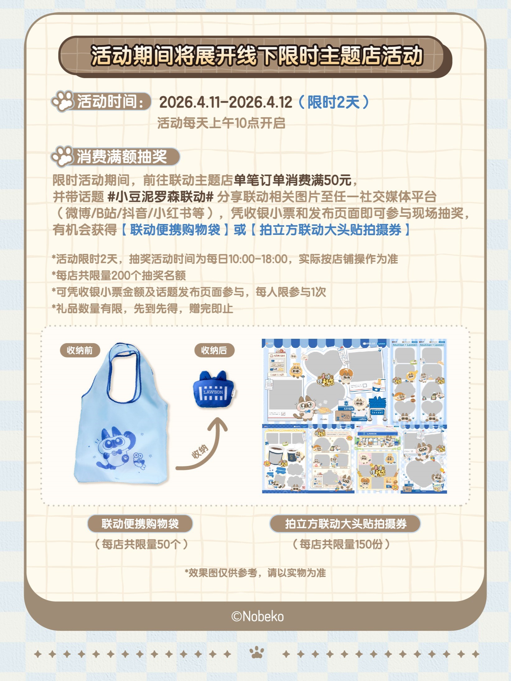 4月11日-4月12日主题店活动日期间,前往联动主题店单笔订单消费满50元,并带话题#小豆泥罗森联动分享联动相关图片至任一社交媒体平台,凭收银小票和发布页面即可参与现场抽奖,有机会获得【联动便携购物袋】或【拍立方联动大头贴拍摄券】。