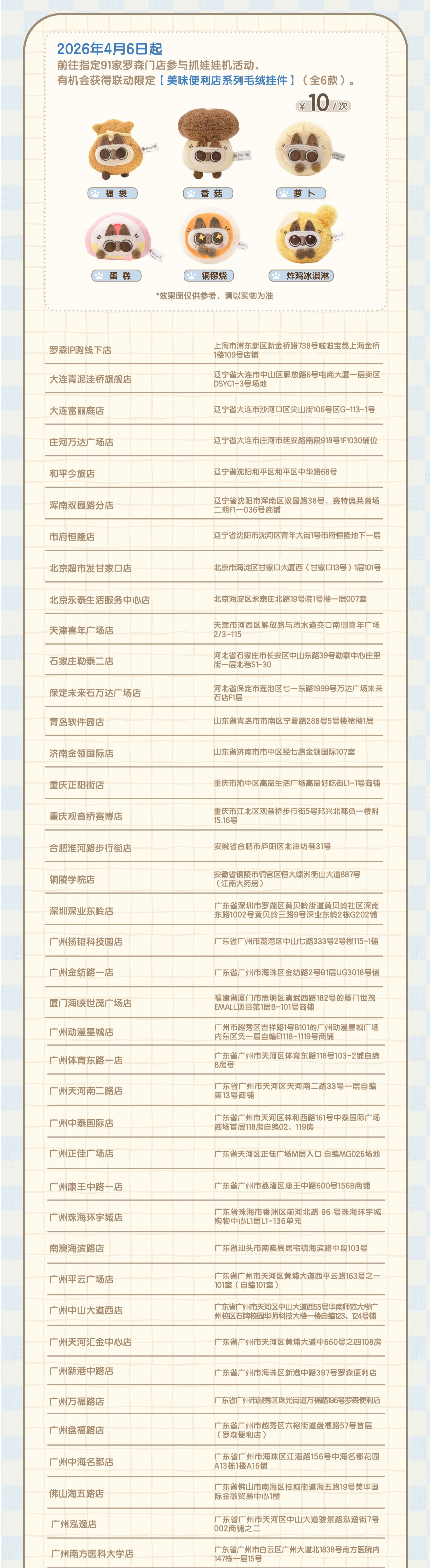 全国90家罗森抓娃娃机体验店将上新联动限定【美味便利店】系列毛绒挂件。快来线下门店试试手气,解锁你的幸运好礼吧。