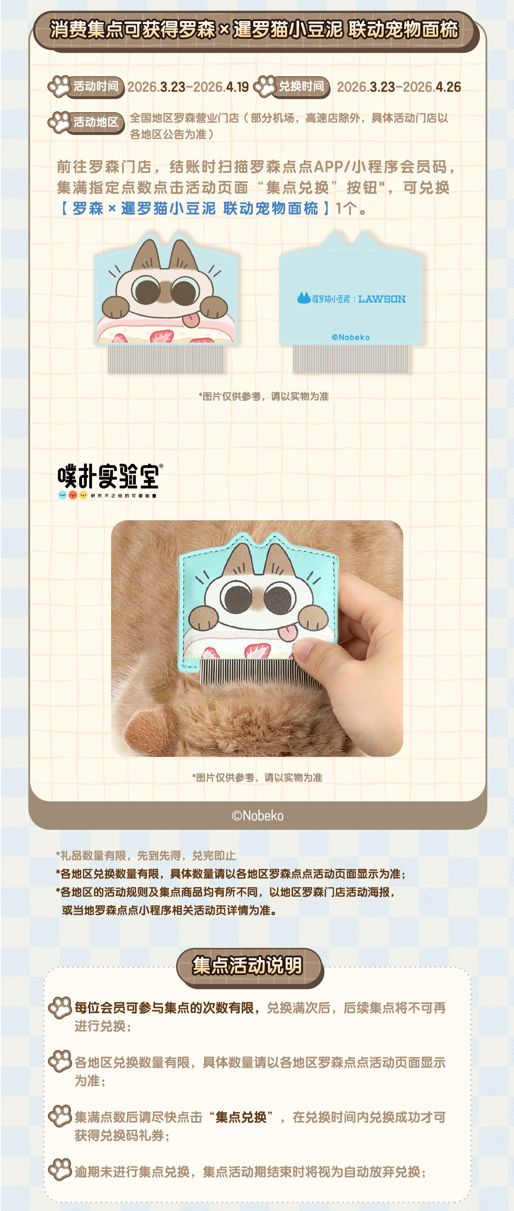 前往罗森门店,结账时扫描罗森点点小程序会员码,集满指定点数后,点击活动页面“集点兑换”按钮",可兑换【罗森×暹罗猫小豆泥 联名宠物面梳】1个。